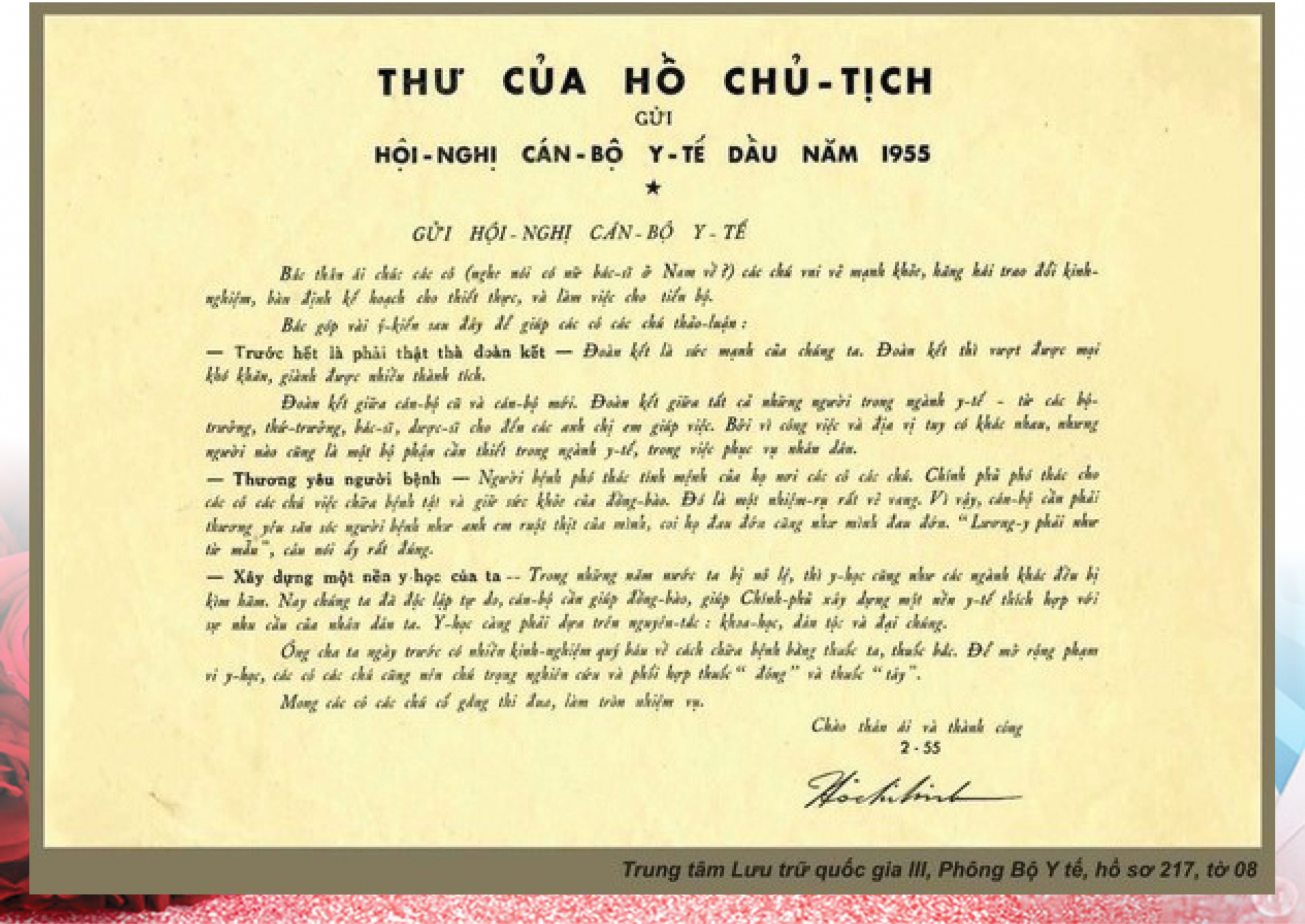 Trong thư gửi Hội nghị cán bộ y tế ngày 27/2/1955, Chủ tịch Hồ Chí Minh đã căn dặn: “Người bệnh phó thác tính mệnh của họ nơi các cô, các chú. Chính phủ phó thác cho các cô, các chú việc chữa bệnh và giữ sức khỏe cho đồng bào. Đó là nhiệm vụ rất vẻ vang. Vì vậy, cán bộ cần phải thương yêu, chăm sóc người bệnh như anh em ruột thịt của mình, coi họ đau đớn cũng như mình đau đớn. Lương y phải như từ mẫu...”. Tuy ngắn gọn chỉ hơn 300 từ, nhưng Bác nêu rõ ba nội dung hết sức quan trọng của ngành Y tế, đó là: Phải thật thà đoàn kết; thương yêu người bệnh; xây dựng nền y học của ta.