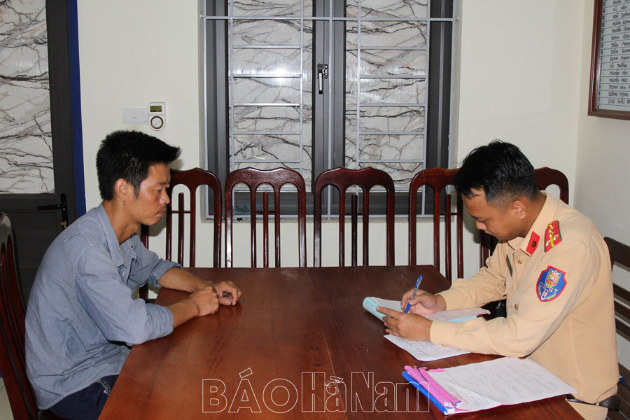 Lực lượng Cảnh sát giao thông, Công an huyện Kim Bảng lập biên bản xử phạt hành chính đối với lái xe Hoàng Văn Quá.