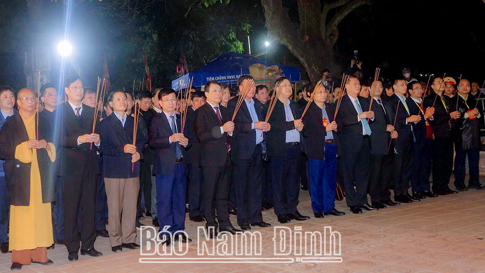 | Các đồng chí lãnh đạo Trung ương, lãnh đạo tỉnh dâng hương tưởng nhớ các vua Trần và Đức Thánh Trần - Quốc công Tiết chế Hưng Đạo Đại vương Trần Quốc Tuấn. |