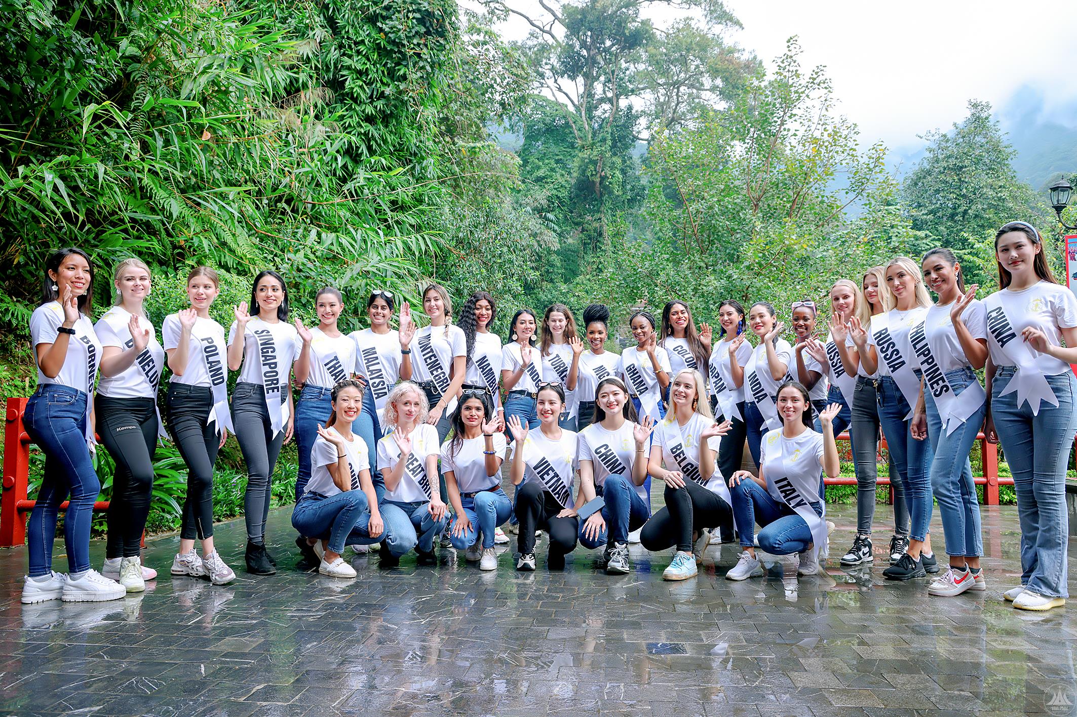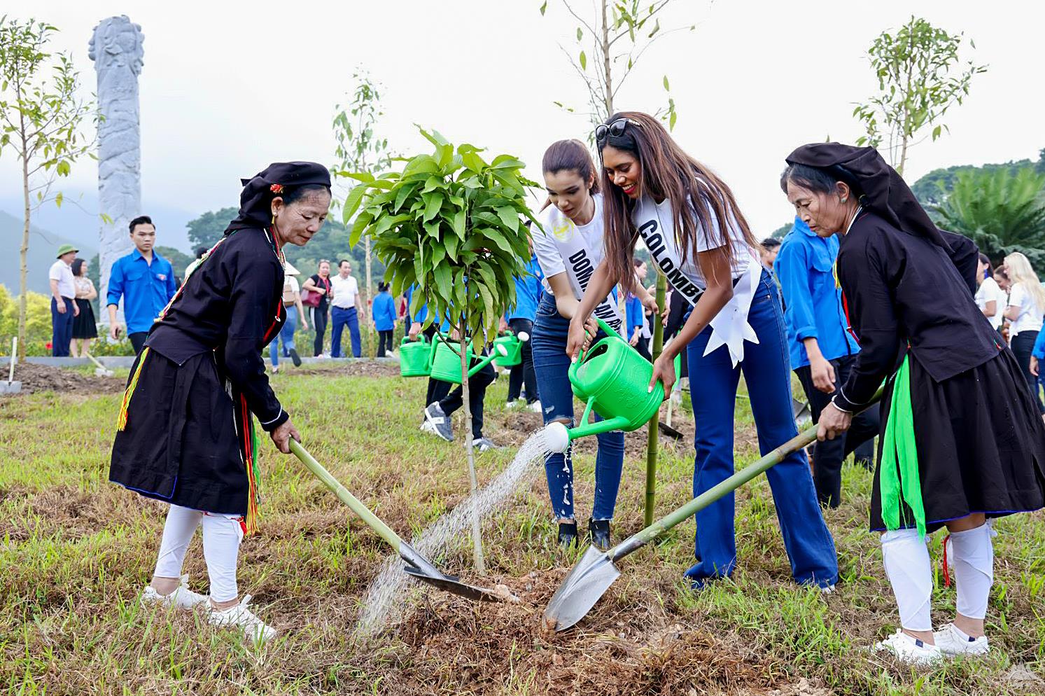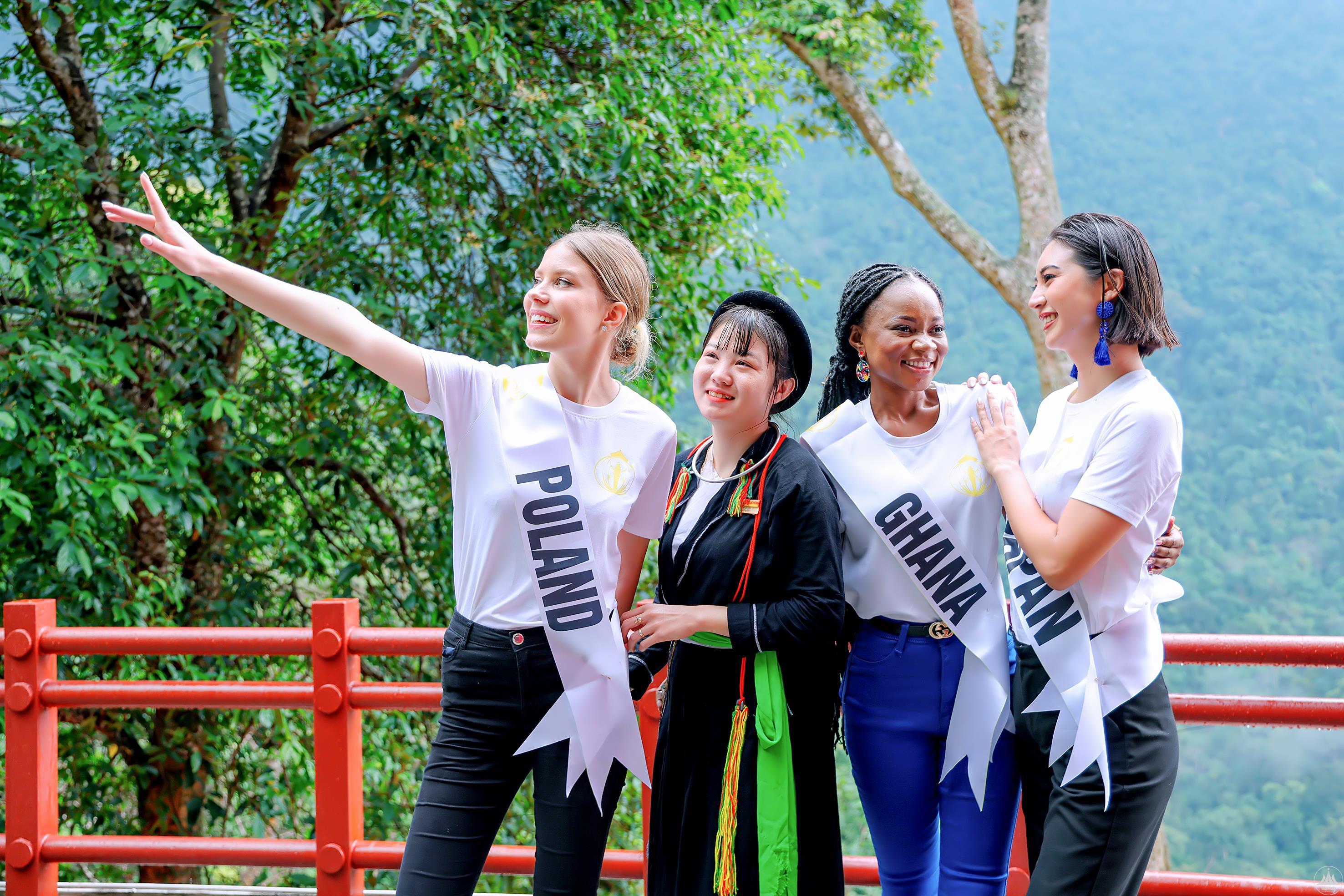 Các thí sinh hoa hậu tươi cười, phấn khởi khi có mặt tại Lễ phát động trồng cây năm 2023 vì mục tiêu “Phát triển du lịch và bảo vệ môi trường” được tổ chức tại Khu danh thắng Tây Thiên, thị trấn Đại Đình, huyện Tam Đảo