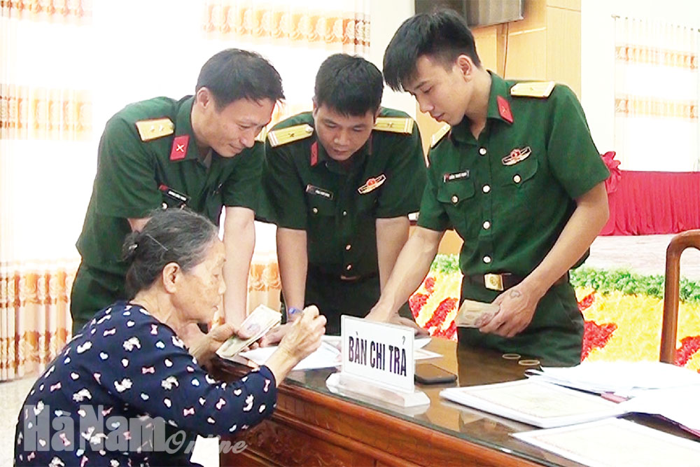 Trong thực hiện chế độ, chính sách hậu phương quân đội, đơn vị đã tiếp nhận, xét duyệt hồ sơ chi trả theo Quyết định 142 của Thủ tướng Chính phủ (đối tượng tồn sót) cho 30 trường hợp; chi trả theo Quyết định 62 của Thủ tướng Chính phủ cho 3.200 đối tượng (với số tiền trên 12 tỷ đồng); tiếp nhận, xét duyệt, chi trả theo Quyết định 49 của Thủ tướng Chính phủ đối với 1.059 đối tượng. Hằng năm, cơ quan quân sự huyện chủ động phối hợp với các đơn vị tặng quà thương binh, gia đình liệt sĩ; nhận phụng dưỡng một Bà mẹ Việt Nam Anh hùng. Trong phong trào “Quân đội chung sức xây dựng nông thôn mới”, CBCS LLVT huyện tham gia đóng góp hơn 3.000 ngày công, tu sửa 6,5km đường giao thông nội đồng, nạo vét trên 7km kênh mương; xử lý trên 10 tấn rác thải; phối hợp tổ chức khám, chữa bệnh miễn phí cho hơn 1.000 đối tượng chính sách. Đặc biệt, để góp phần tạo cảnh quan môi trường của huyện nông thôn mới sạch, đẹp, Ban CHQS huyện đã vận động, xây dựng 18 bồn hoa cảnh dọc tuyến đường chính của huyện với tổng trị giá trên 18 triệu đồng.