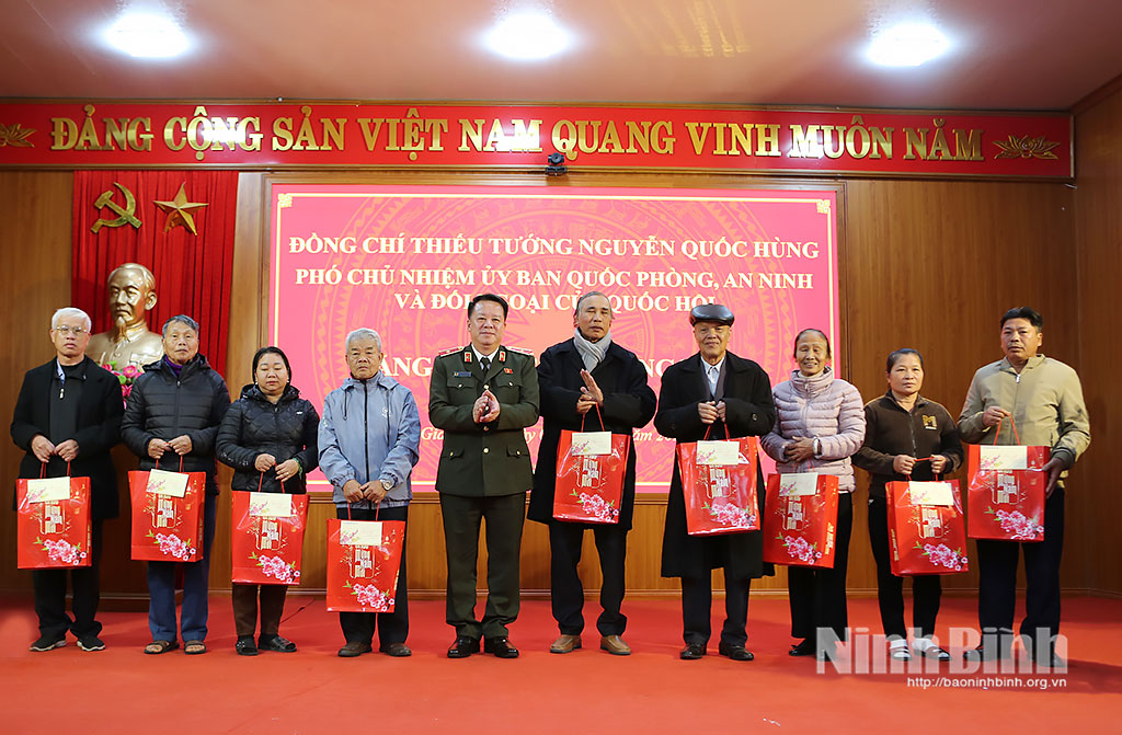 Phát biểu tại buổi gặp gỡ, đồng chí Thiếu tướng Nguyễn Quốc Hùng bày tỏ lòng tri ân sâu sắc đối với các Anh hùng liệt sỹ, các thương binh, bệnh binh, gia đình người có công với cách mạng; chia sẻ những khó khăn đối với các đối tượng bảo trợ xã hội và hộ cận nghèo; chúc các gia đình đón năm mới vui vẻ, bình an.