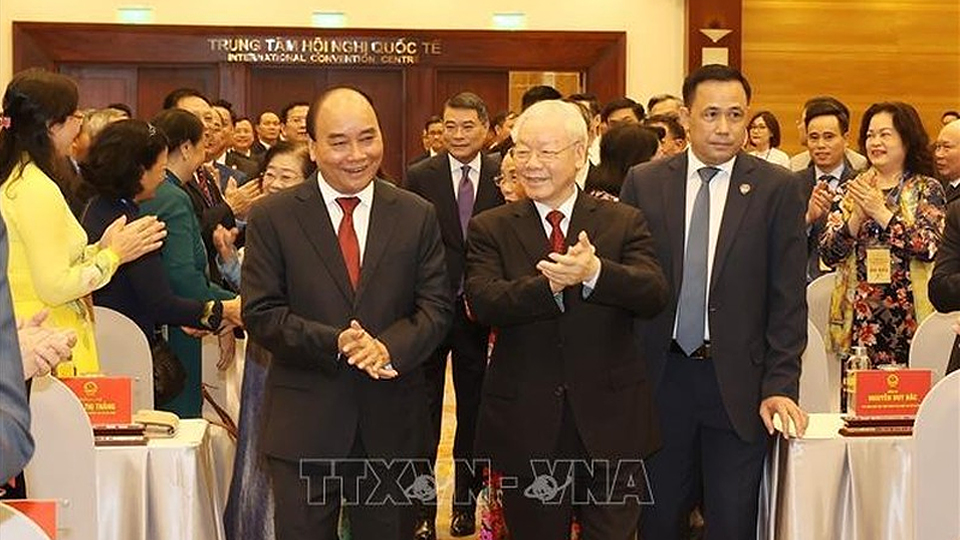 | Tổng Bí thư Nguyễn Phú Trọng và Chủ tịch nước Nguyễn Xuân Phúc đến dự Lễ kỷ niệm. Ảnh: TTXVN |