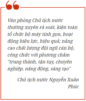 Được sự quan tâm lãnh đạo, chỉ đạo của Đảng, Nhà nước, trực tiếp là Chủ tịch nước, Phó Chủ tịch nước qua các thời kỳ, sự phối hợp chặt chẽ, có hiệu quả của các Văn phòng Trung ương, các ban, bộ, ngành, sự ủng hộ, giúp đỡ của các địa phương và các tầng lớp nhân dân, Văn phòng Chủ tịch nước ngày càng lớn mạnh về mọi mặt; tổ chức bộ máy, chức năng, nhiệm vụ, chế độ công tác không ngừng được hoàn thiện. Các thế hệ lãnh đạo, cán bộ, công chức, người lao động Văn phòng Chủ tịch nước luôn tuyệt đối trung thành với Đảng, Tổ quốc và nhân dân, nêu cao tinh thần trách nhiệm, sáng tạo, đổi mới; tận tụy, tâm huyết với công việc, ngày càng trưởng thành. Cán bộ, viên chức, người lao động Văn phòng Chủ tịch nước đã thực hiện tốt các chủ trương, chỉ đạo của Bộ Chính trị, Ban Bí thư và lời căn dặn của Tổng Bí thư Nguyễn Phú Trọng, nguyên Chủ tịch nước khi bàn giao công việc đầu nhiệm kỳ.