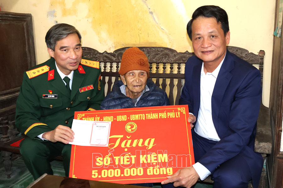 Nhân kỷ niệm 80 năm Ngày thành lập Quân đội nhân dân Việt Nam và 35 năm Ngày hội Quốc phòng toàn dân, chiều 17/12, đoàn cán bộ lãnh đạo thành phố do đồng chí Đào Đình Tùng, Ủy viên Ban Thường vụ Tỉnh ủy, Bí thư Thành ủy Phủ Lý làm trưởng đoàn đã đi thăm, tặng quà, tặng sổ tiết kiệm cho các đối tượng chính sách có hoàn cảnh khó khăn trên địa bàn.
