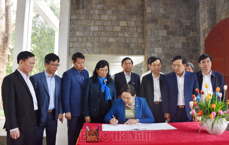 Đồng chí Bí thư Tỉnh ủy Hà Nam Lê Thị Thủy ghi sổ lưu niệm tại Nghĩa trang liệt sĩ A1.