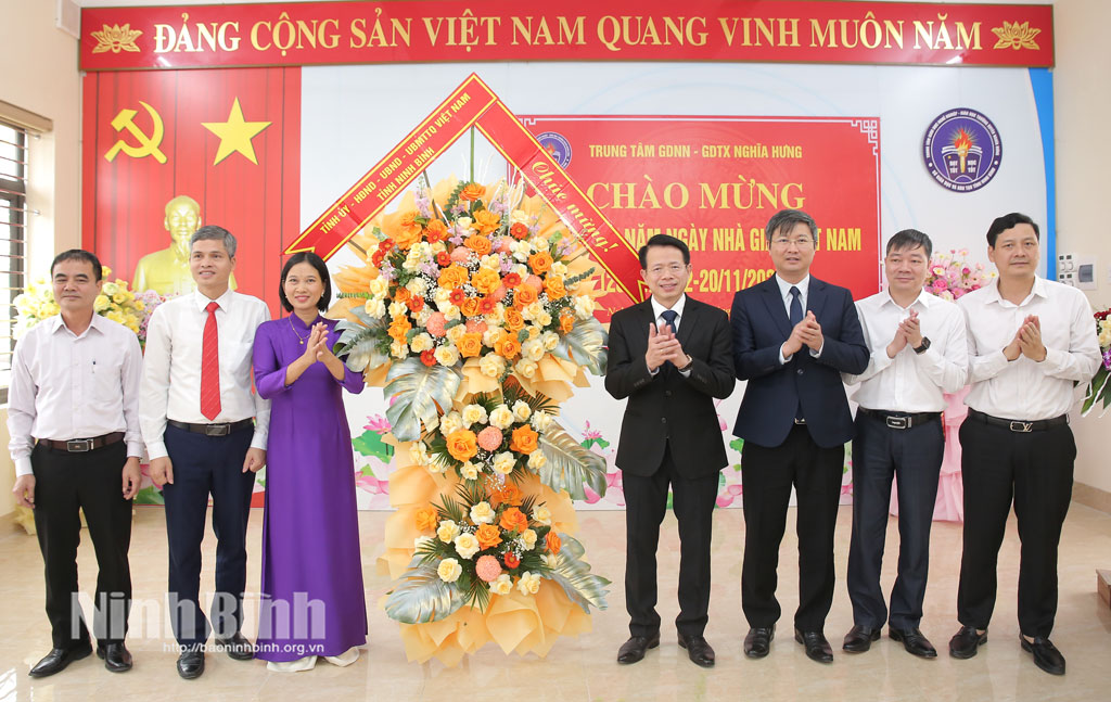 * Đoàn đại biểu của tỉnh do đồng chí Nguyễn Hải Dũng, Tỉnh ủy viên, Phó Trưởng Đoàn ĐBQH tỉnh làm Trưởng đoàn đã đến thăm, chúc mừng tập thể cán bộ, giáo viên Trung tâm Giáo dục nghề nghiệp - Giáo dục thường xuyên (GDNN - GDTX) Nghĩa Hưng. Cùng dự có đồng chí Lê Văn Cường, Tỉnh ủy viên, Phó Bí thư Chuyên trách Đảng ủy UBND tỉnh; đại diện lãnh đạo Sở Giáo dục và Đào tạo; lãnh đạo xã Nghĩa Hưng.