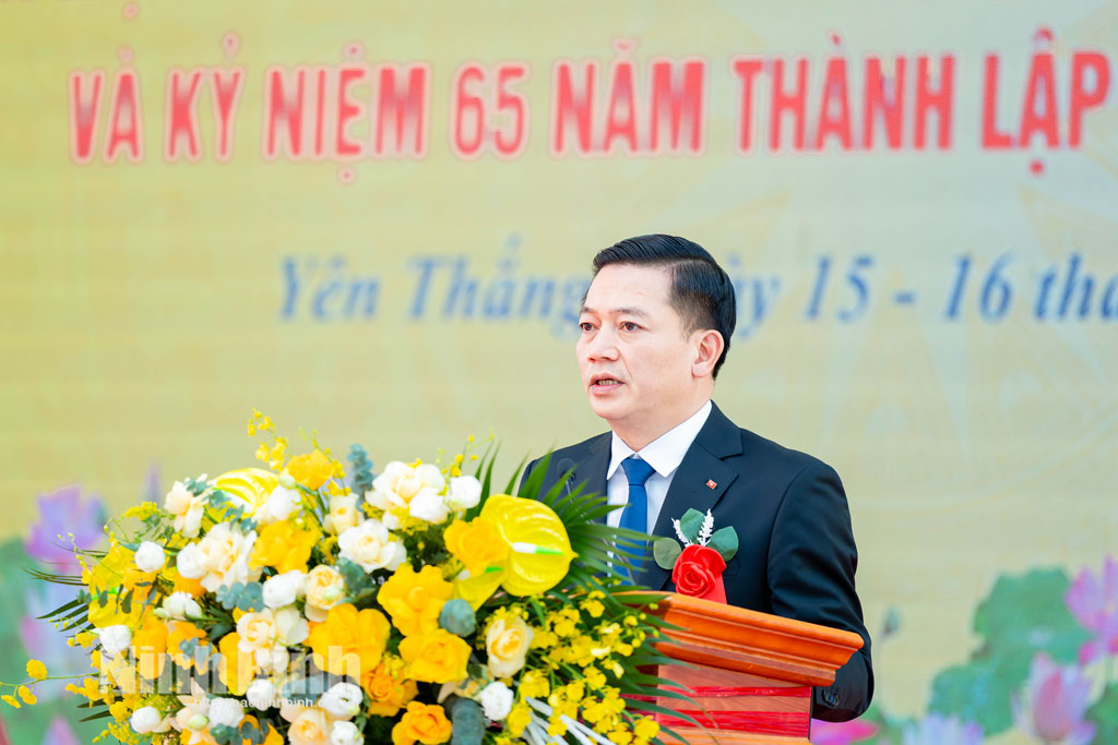 Phát biểu tại buổi lễ, đồng chí Nguyễn Cao Sơn, Tỉnh ủy viên, Phó Chủ tịch UBND tỉnh, đã biểu dương những kết quả tích cực mà ngành giáo dục tỉnh Ninh Bình nói chung và Trường THCS Yên Thắng nói riêng đã đạt được, góp phần đưa chất lượng giáo dục tỉnh nhà xếp vị trí tốp đầu toàn quốc. Đồng chí nhấn mạnh, phát huy truyền thống 65 năm vẻ vang, tập thể sư phạm Trường THCS Yên Thắng cần tiếp tục quán triệt sâu sắc và triển khai thực hiện sáng tạo, hiệu quả các chủ trương, đường lối của Đảng, chính sách, pháp luật của Nhà nước về giáo dục. Không ngừng đổi mới tư duy quản lý, quản trị nhà trường theo hướng hiện đại, dân chủ, chuyên nghiệp. Đặc biệt, chăm lo xây dựng và phát triển đội ngũ nhà giáo, cán bộ quản lý. Cùng với việc nâng cao chất lượng giáo dục văn hóa, cần đặc biệt coi trọng giáo dục đạo đức, lý tưởng sống, kỹ năng sống, kỹ năng ngoại ngữ, tin học. Đẩy mạnh chuyển đổi số trong dạy và học; tăng cường đầu tư, hiện đại hóa cơ sở vật chất, trang, thiết bị dạy học. Phấn đấu xây dựng Trường THCS Yên Thắng trở thành một trong những trường THCS hàng đầu của tỉnh.