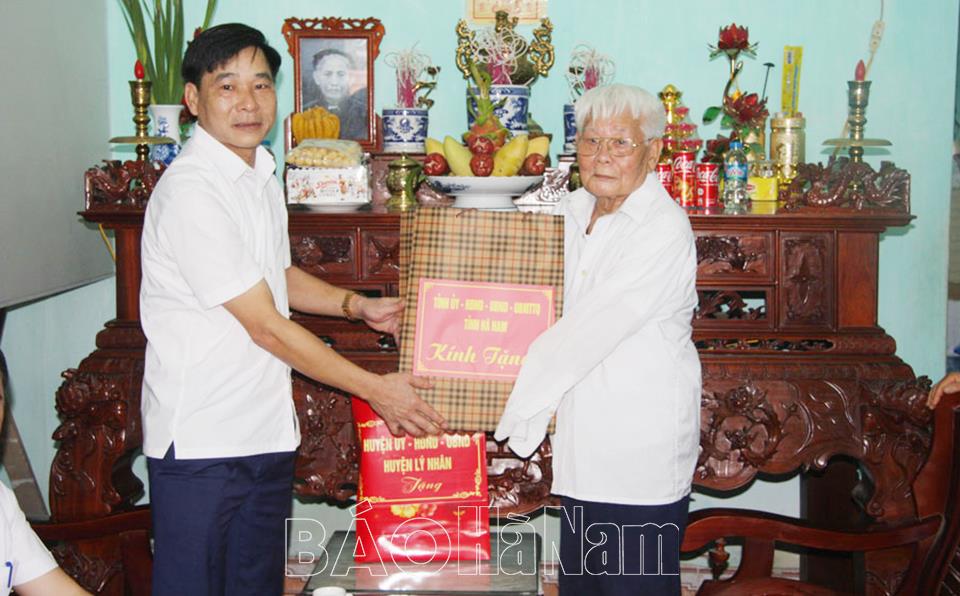 Đồng chí Phó Chủ tịch Thường trực UBND tỉnh Nguyễn Anh Chức tặng quà ông Trần Văn Tộ, chiến sĩ Điện Biên đang sinh sống tại thị trấn Vĩnh Trụ (Lý Nhân).