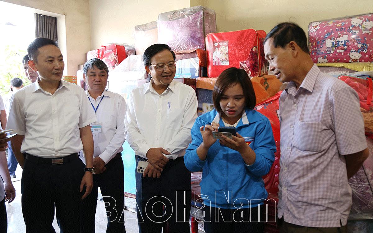 Đồng chí Nguyễn Đức Vượng, Phó Chủ tịch UBND tỉnh cùng đoàn công tác kiểm tra việc cán bộ Đoàn xã Thanh Hương (Thanh Liêm) hướng dẫn người dân cài đặt và sử dụng ứng dụng số trên điện thoại thông minh.
