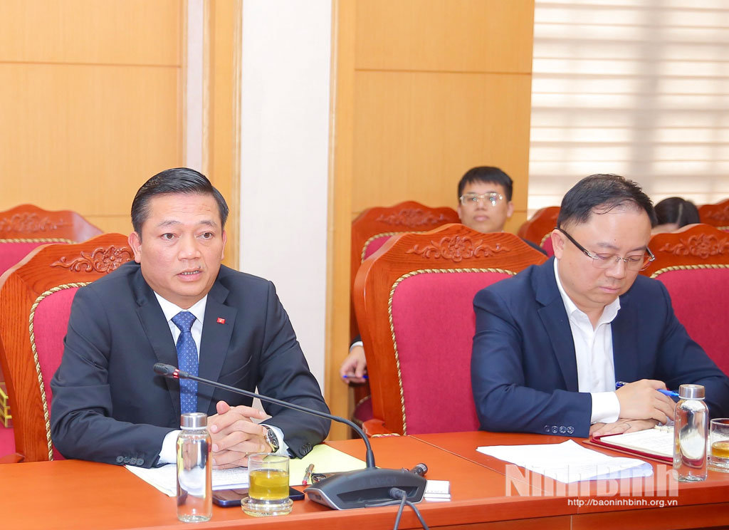 Tại buổi tiếp, đồng chí Phó Chủ tịch UBND tỉnh Nguyễn Cao Sơn bày tỏ vui mừng chào đón Đoàn công tác đến thăm và làm việc tại Ninh Bình, đồng thời giới thiệu khái quát tình hình phát triển kinh tế- xã hội, những tiềm năng, thế mạnh của tỉnh trong các lĩnh vực du lịch, công nghiệp thời gian qua. Đồng chí cho biết, sau khi thực hiện mô hình chính quyền địa phương 2 cấp, tỉnh Ninh Bình quy mô kinh tế đứng thứ 10 cả nước, thu ngân sách đứng thứ 7 toàn quốc. Với vị trí chiến lược ở cửa ngõ phía Nam Đồng bằng sông Hồng, là điểm giao thoa kết nối với miền Trung và vùng Tây Bắc, cùng Quần thể Danh thắng Tràng An - Di sản Văn hóa và Thiên nhiên thế giới, Ninh Bình là điểm đến hấp dẫn đối với du khách và các nhà đầu tư trong nước, quốc tế.