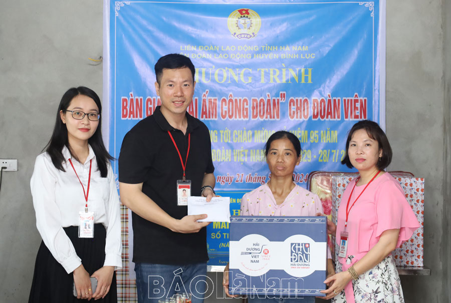Lãnh đạo LĐLĐ tỉnh, LĐLĐ huyện Bình Lục trao biển tượng trưng kinh phí hỗ trợ cho đoàn viên Nguyễn Thị Thuận.