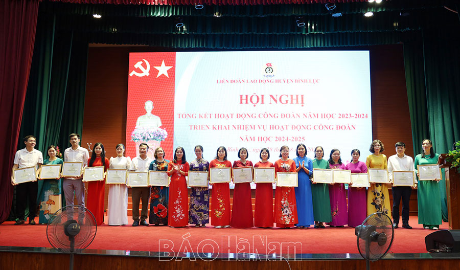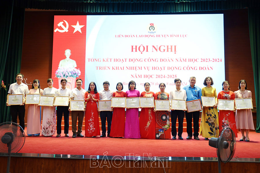 Sáng 28/8, Liên đoàn Lao động (LĐLĐ) huyện Bình Lục tổ chức hội nghị tổng kết hoạt động công đoàn năm học 2023 - 2024; triển khai phương hướng, nhiệm vụ hoạt động năm học 2024 - 2025 và tổ chức tuyên dương, khen thưởng con đoàn viên, công nhân, viên chức, lao động (CNVCLĐ) đạt thành tích cao trong học tập. Dự hội nghị có lãnh đạo LĐLĐ tỉnh, huyện Bình Lục, cùng các chủ tịch công đoàn cơ sở (CĐCS), học sinh được tuyên dương.