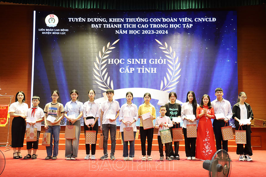 Các em học sinh đạt danh hiệu Học sinh giỏi cấp tỉnh được LĐLĐ huyện Bình Lục khen thưởng.