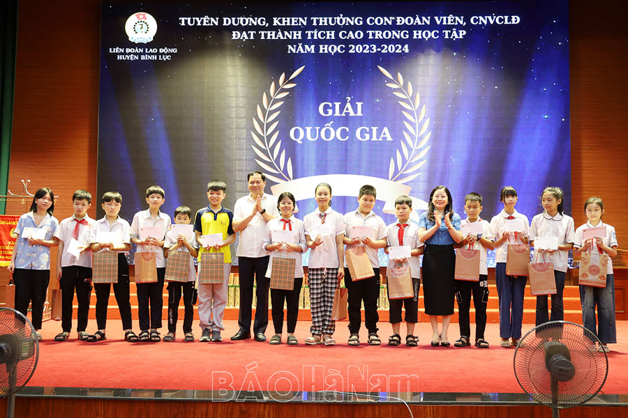 Lãnh đạo LĐLĐ tỉnh và Huyện ủy Bình Lục khen thưởng, tặng quà con CNVCLĐ đạt thành tích cao trong năm học 2023 - 2024.