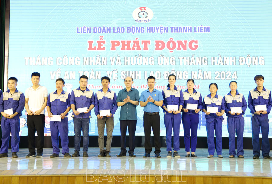 Sáng 4/5, Liên đoàn Lao động (LĐLĐ) huyện Thanh Liêm tổ chức Lễ phát động Tháng Công nhân và hưởng ứng Tháng hành động về An toàn, vệ sinh lao động (ATVSLĐ) năm 2024. Dự buổi lễ có lãnh đạo LĐLĐ tỉnh, huyện Thanh Liêm, chủ tịch các công đoàn cơ sở trực thuộc và 100 đoàn viên, công nhân lao động (CNLĐ) được tặng quà.