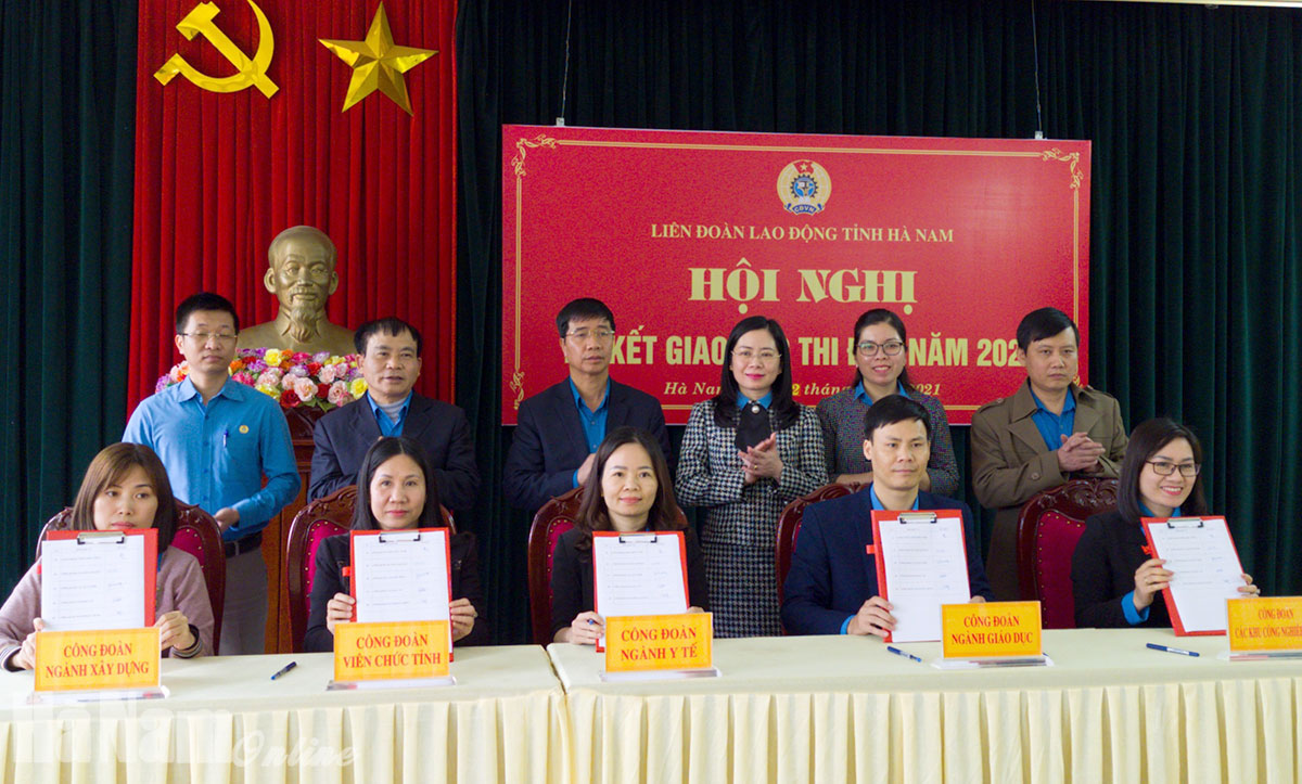 Tại hội nghị, 3 khối thi đua thuộc hệ thống LĐLĐ tỉnh bao gồm khối các huyện, thị xã, thành phố; khối Công đoàn ngành, Công đoàn các KCN; khối các ban LĐLĐ tỉnh, Trường Trung cấp Kinh tế - Kỹ thuật Hà Nam đã ký giao ước thi đua năm 2021 với 10 nhiệm vụ trọng tâm. Điển hình như: Xây dựng kế hoạch, tổ chức học tập quán triệt Nghị quyết đại hội Đảng các cấp, chỉ thị, nghị quyết của Tổng Liên đoàn, của Tỉnh ủy năm 2021. Tổ chức tập huấn cho 100% đội ngũ cán bộ CĐCS. Tuyên truyền cho bầu cử đại biểu Quốc hội và HĐND các cấp nhiệm kỳ 2021-2026, các ngày lễ trong năm, phòng chống dịch bệnh. Hoàn thành 100% chỉ tiêu được giao về phát triển đoàn viên, thành lập CĐCS, ký kết thỏa ước lao động tập thể tại doanh nghiệp, ký thỏa thuận hợp tác, hỗ trợ xây dựng nhà “Mái ấm công đoàn”; kế hoạch giao nộp nghĩa vụ về tài chính; tỷ lệ giao kiểm tra Điều lệ, kiểm tra tài chính cùng cấp và kiểm tra tài chính CĐCS. Hoàn thành 100% chỉ tiêu giao tổ chức Tháng Công nhân tại doanh nghiệp, về vận động đoàn viên, CNVCLĐ tham gia hưởng ứng Chương trình “75 nghìn sáng kiến, vượt khó, phát triển”. Mỗi đơn vị giới thiệu 1 lớp để Trường Trung cấp Kinh tế-Kỹ thuật Hà Nam tổ chức 1 lớp huấn luyện về an toàn vệ sinh lao động với số lượng ít nhất là 100 người.