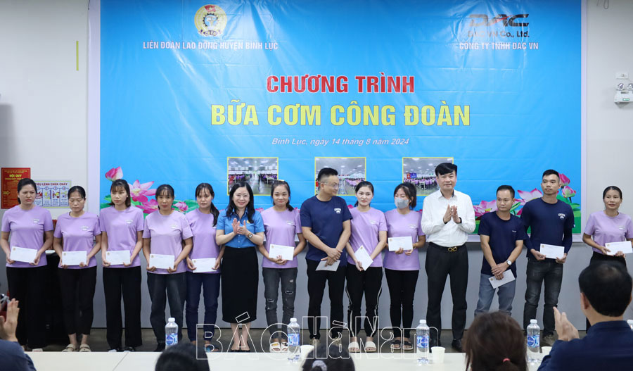 Trưa 14/8, tại Công ty TNHH DAC Việt Nam, xã Trung Lương (Bình Lục), Liên đoàn Lao động (LĐLĐ) huyện Bình Lục phối hợp với Ban Giám đốc Công ty TNHH DAC Việt Nam tổ chức "Bữa cơm công đoàn" cho gần 400 cán bộ, nhân viên, người lao động trong công ty. Lãnh đạo LĐLĐ tỉnh và huyện Bình Lục đã đến dự cùng đoàn viên, người lao động.
