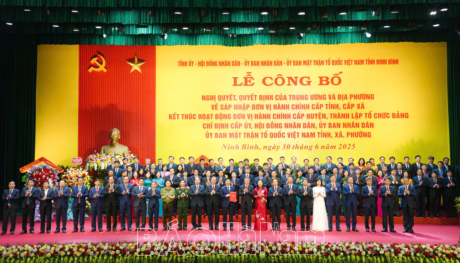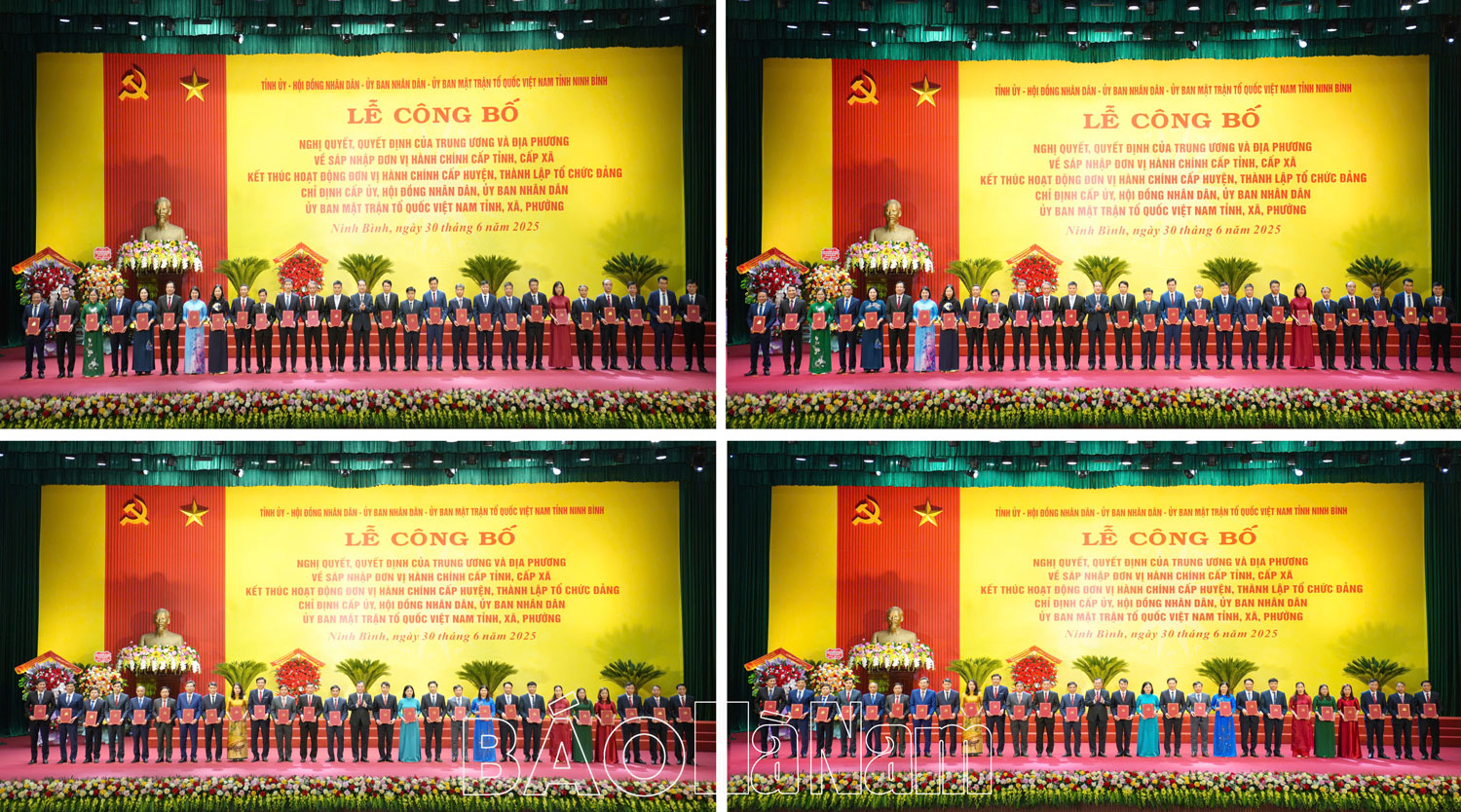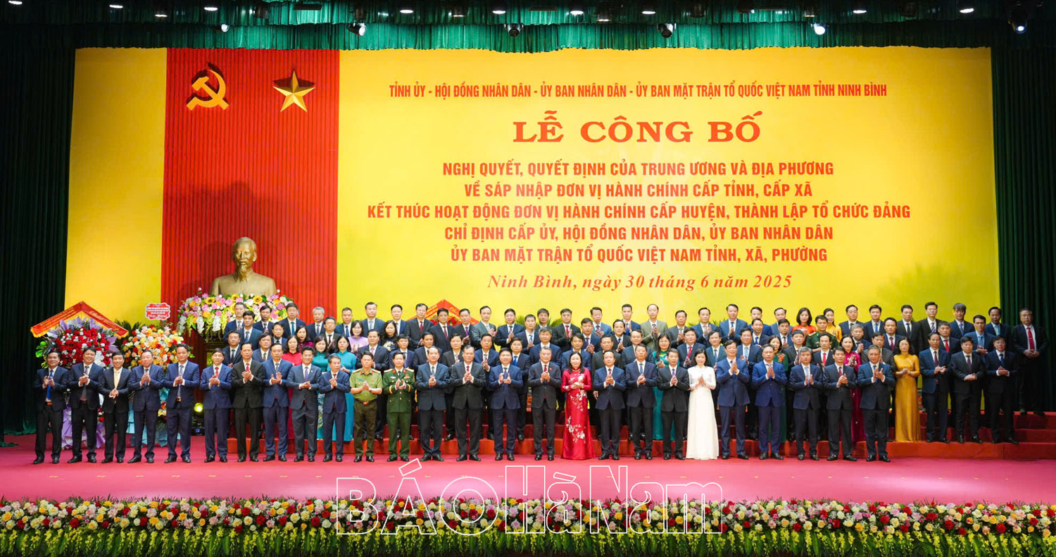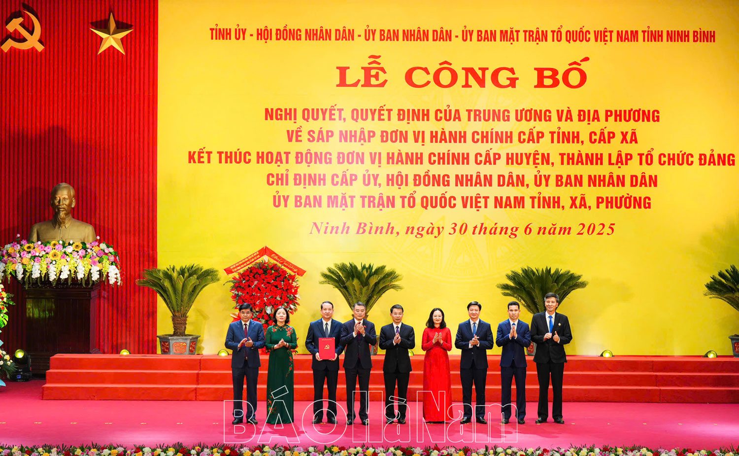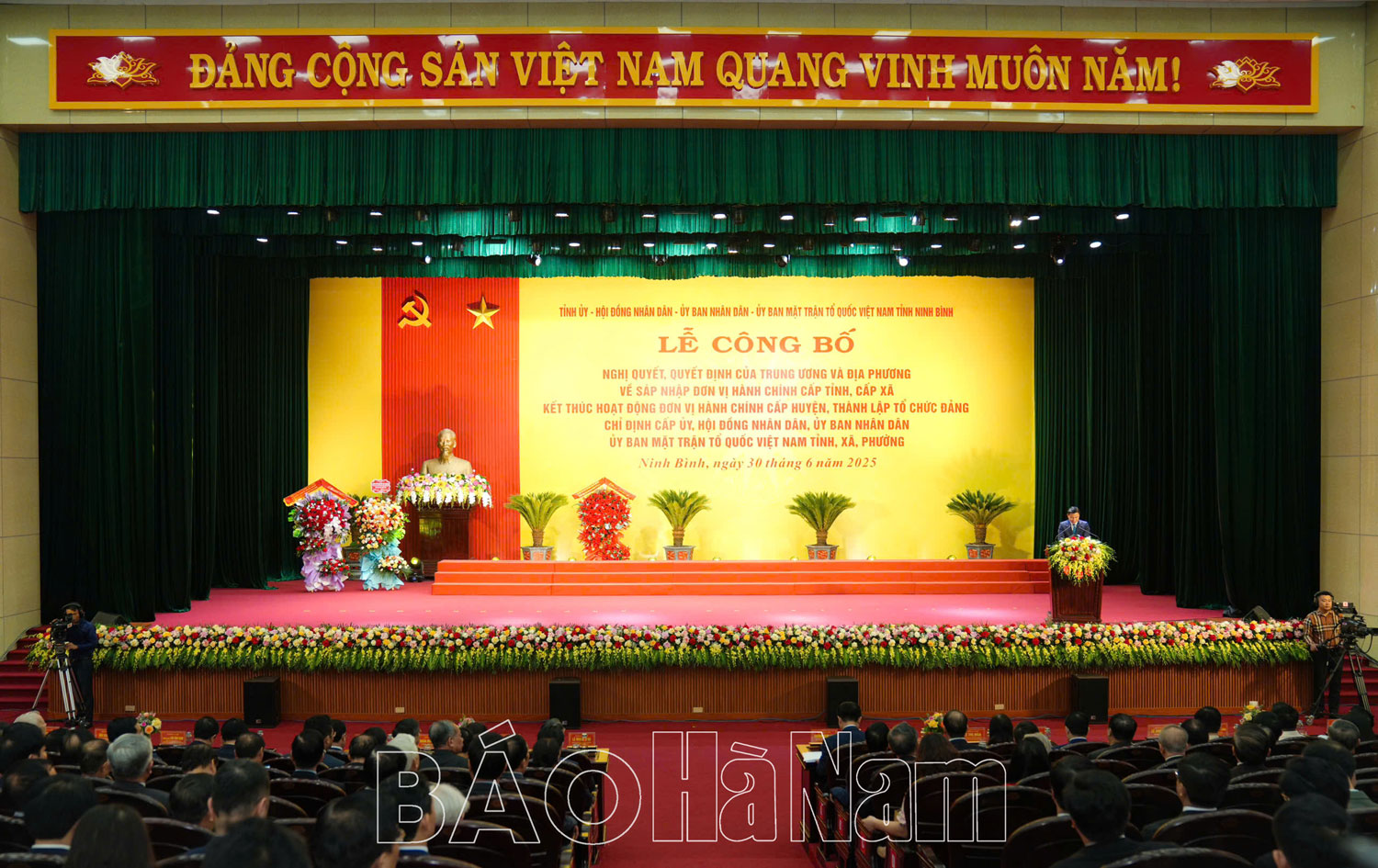 Sáng 30/6, tại Trung tâm Hội nghị tỉnh Ninh Bình long trọng diễn ra Lễ công bố các Nghị quyết, Quyết định của Trung ương, của tỉnh về sáp nhập đơn vị hành chính cấp tỉnh, cấp xã. Dự lễ công bố có các đồng chí: Lê Minh Hưng, Ủy viên Bộ Chính trị, Bí thư Trung ương Đảng, Trưởng Ban Tổ chức Trung ương, Trưởng Đoàn công tác của Trung ương; các Ủy viên Trung ương Đảng: Nguyễn Đình Khang, Chủ tịch Tổng Liên đoàn Lao động Việt Nam; Đỗ Trọng Hưng, Phó Trưởng Ban Tổ chức Trung ương; Lâm Thị Phương Thanh, Phó Chánh văn phòng Thường trực Văn phòng Trung ương Đảng; Lê Thị Nga, Phó Trưởng Ban Thường trực Ủy ban Dân nguyện và Giám sát Quốc hội; Trương Quốc Huy, Bí thư Tỉnh ủy, Chủ tịch UBND tỉnh, Trưởng Đoàn đại biểu Quốc hội tỉnh Hà Nam; Đoàn Minh Huấn, Ủy viên Trung ương Đảng, Bí thư Tỉnh ủy Ninh Bình; Đặng Khánh Toàn, Bí thư Tỉnh ủy Nam Định; các đồng chí nguyên Ủy viên Trung ương Đảng, nguyên lãnh đạo tỉnh Hà Nam, Nam Định, Ninh Bình; lãnh đạo các cơ quan, ban, bộ, ngành Trung ương; các đồng chí Thường trực Tỉnh ủy; Ủy viên Ban Thường vụ Tỉnh ủy; cùng toàn thể cán bộ, đảng viên, nhân dân dự Lễ công bố tại Hội trường trung tâm và điểm cầu tại các xã, phường trên địa bàn toàn tỉnh.