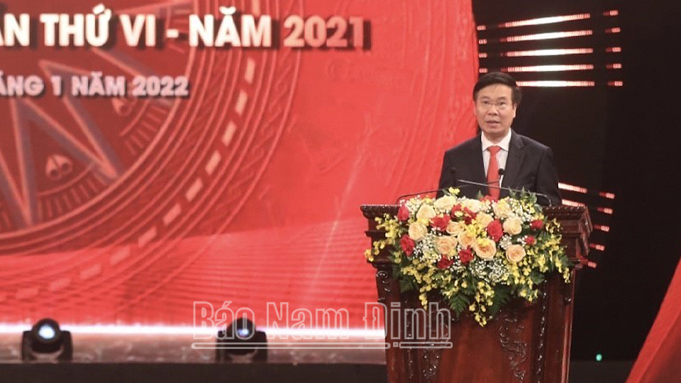 | Đồng chí Võ Văn Thưởng, Ủy viên Bộ Chính trị, Thường trực Ban Bí thư phát biểu tại Lễ công bố và trao Giải Búa liềm vàng lần thứ VI - năm 2021. |