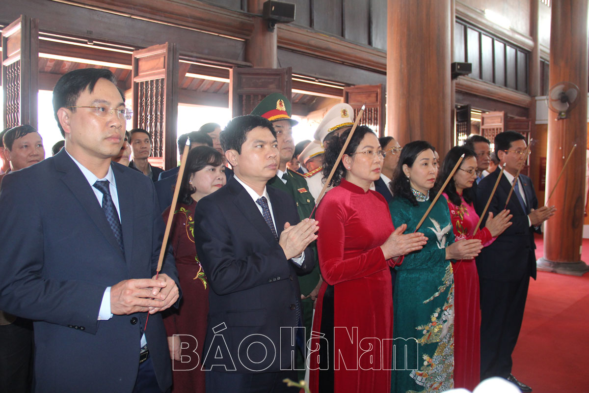 Ngay sau lễ dâng hương, đồng chí Đinh Thị Lụa, Phó Bí thư Thường trực Tỉnh ủy thay mặt Đảng bộ, chính quyền và nhân dân tỉnh báo công dâng Bác: Năm 2022 mặc dù gặp nhiều khó khăn, thách thức, song được sự quan tâm giúp đỡ của Trung ương Đảng, Quốc hội, Chính phủ, các Ban, bộ ngành, đoàn thể Trung ương, sự nỗ lực cố gắng của cả hệ thống chính trị và các tầng lớp nhân dân, tỉnh Hà Nam đã vươn lên bằng một diện mạo mới với tốc độ tăng trưởng kinh tế cao, đạt 10,82%, đứng thứ 3 vùng Đồng bằng sông Hồng và thứ 12 trong cả nước; tổng thu ngân sách đạt gần 16.000 tỷ đồng, gấp 228 lần so với năm 1997 (thu ngân sách đạt 70 tỷ đồng); đảm bảo tự chủ ngân sách.