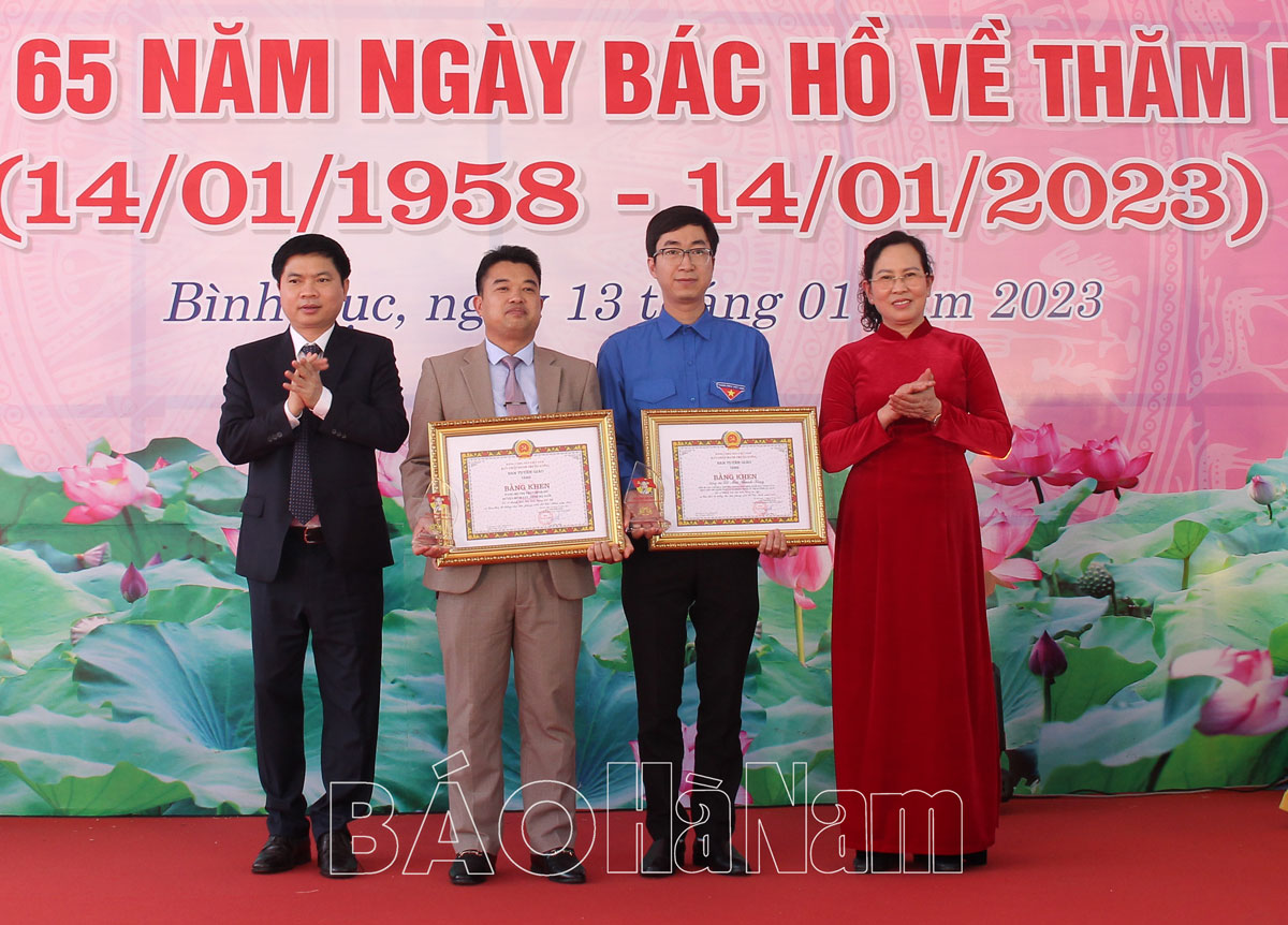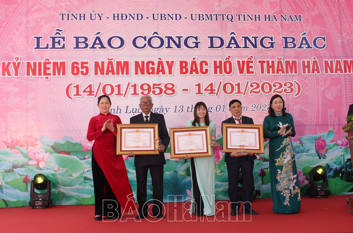 Tại Lễ báo công, Ban Tổ chức đã trao Bằng khen của Thủ tướng Chính phủ cho 1 tập thể (Đảng bộ xã Mộc Bắc, thị xã Duy Tiên) và 2 cá nhân (bà Phan Thị Hiền, Bí thư chi bộ, Trưởng thôn Phù Lưu 1, xã Nguyễn Úy, huyện Kim Bảng và ông Nguyễn Văn Liên, Tổ trưởng Tổ trật tự an toàn giao thông thôn Nha Tiến, xã Nhân Bình, huyện Lý Nhân); trao Bằng khen của Ban Tuyên giáo Trung ương cho 1 tập thể (Đảng bộ Thị trấn Bình Mỹ, huyện Bình Lục) và 2 cá nhân (Đồng chí Lữ Mai Thanh Tùng, Phó Bí thư Chi bộ 3, Trưởng phòng Phổ biến, giáo dục pháp luật- Theo dõi thi hành pháp luật, Sở Tư pháp và em Trần Đức Minh, nguyên học sinh lớp 12 chuyên Hóa, Trường THPT Chuyên Biên Hòa) điển hình trong học tập và làm theo tư tưởng, đạo đức, phong cách Hồ Chí Minh năm 2022.