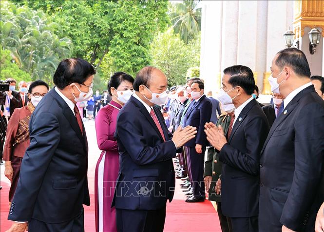 Kết thúc Lễ đón chính thức, Chủ tịch nước Nguyễn Xuân Phúc và Phu nhân cùng Tổng Bí thư, Chủ tịch nước Lào Thongloun Sisoulith rời sang phòng gặp ngắn, chuẩn bị tiến hành hội đàm cấp cao.