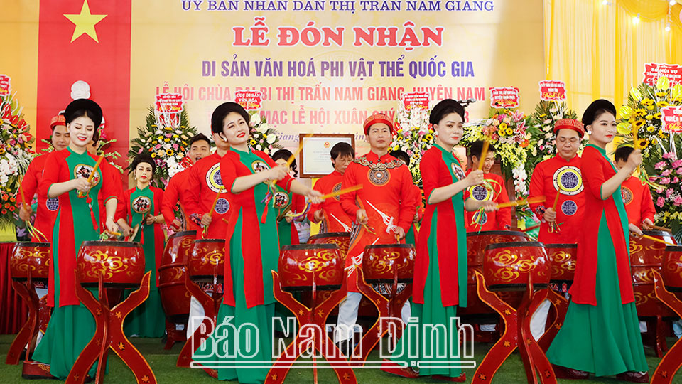 | Màn múa trống hội trong lễ đón Bằng chứng nhận Lễ hội Chùa Đại Bi, thị trấn Nam Giang (Nam Trực) là di sản văn hóa phi vật thể quốc gia. |