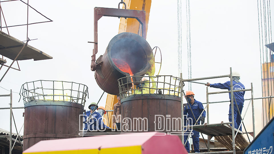 | Đồng được rót vào khuôn đúc. |
