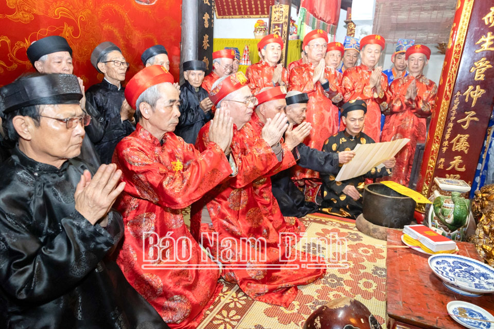 | Các bậc cao niên phường Lộc Vượng thực hiện nghi thức tâm linh trước khi rước kiệu Ngọc Lộ. |