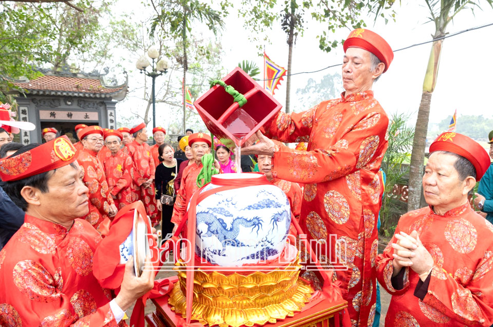 | Nước từ chóe được dâng lên ban thờ tại Đền Thiên Trường. |