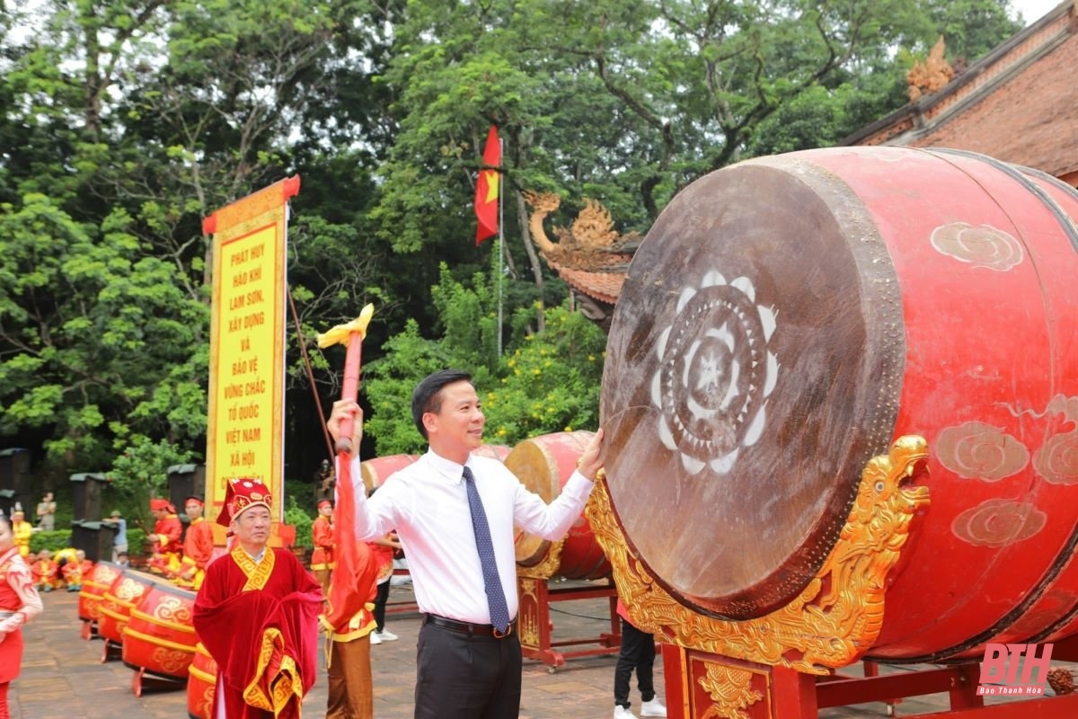 | Đồng chí Đỗ Trọng Hưng, Ủy viên Trung ương Đảng, Bí thư Tỉnh ủy, Chủ tịch HĐND tỉnh đánh trống khai hội. |