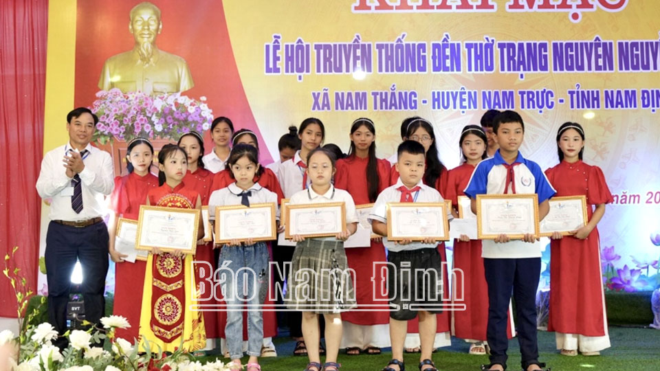 | Trao thưởng cho học sinh có thành tích học tập xuất sắc trong Lễ khai mạc lễ hội truyền thống Đền thờ Trạng nguyên Nguyễn Hiền. |