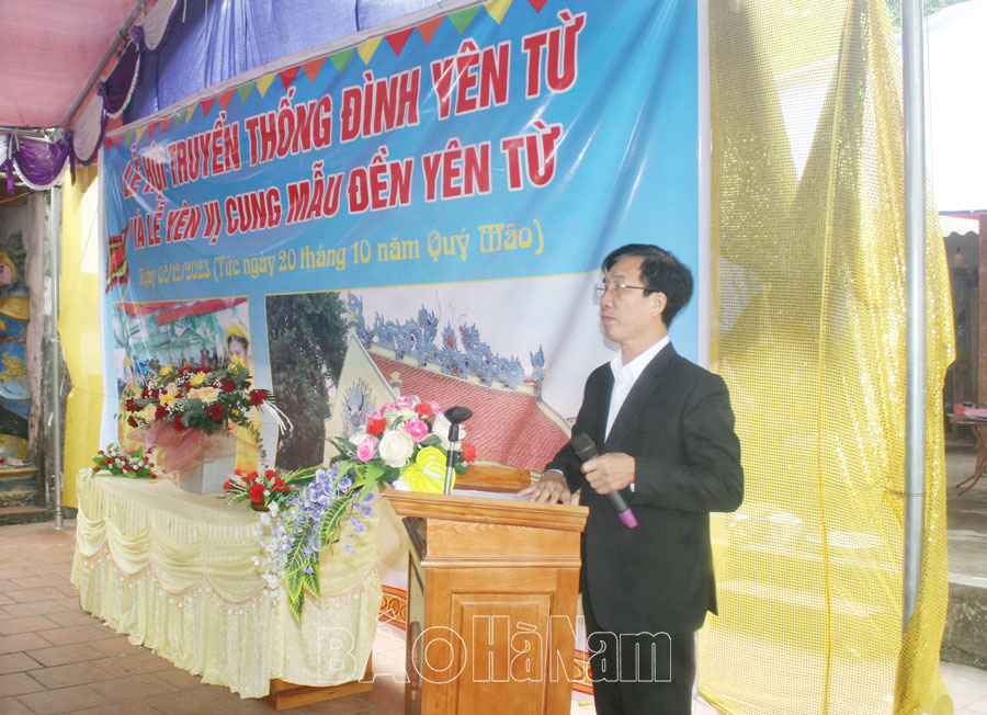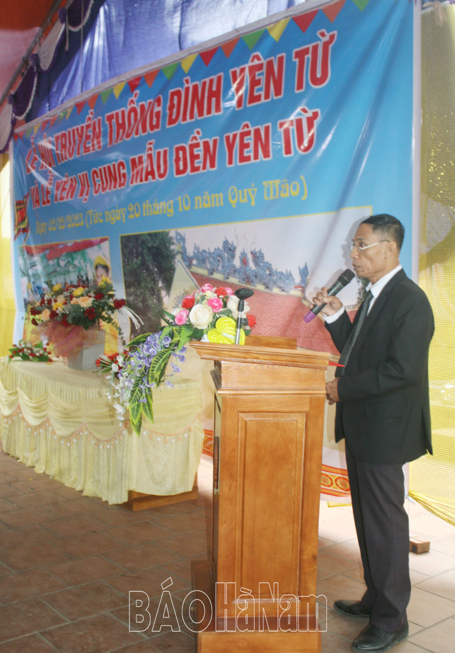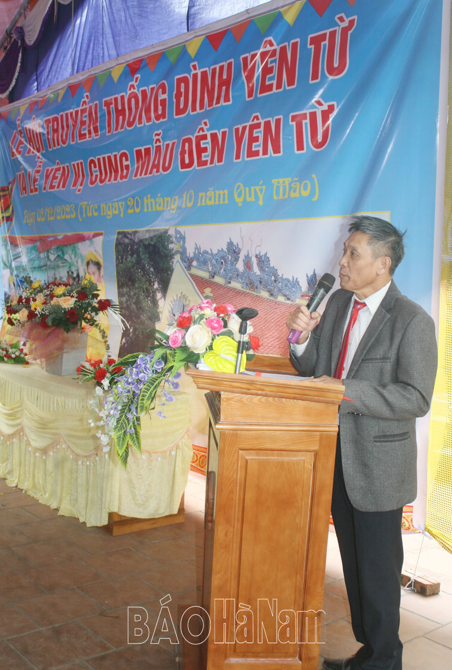 Đại diện lãnh đạo thôn Yên Bình báo cáo tình hình phát triển KT-XH của thôn và đóng góp ủng hộ của nhân dân, quý khách thập phương.