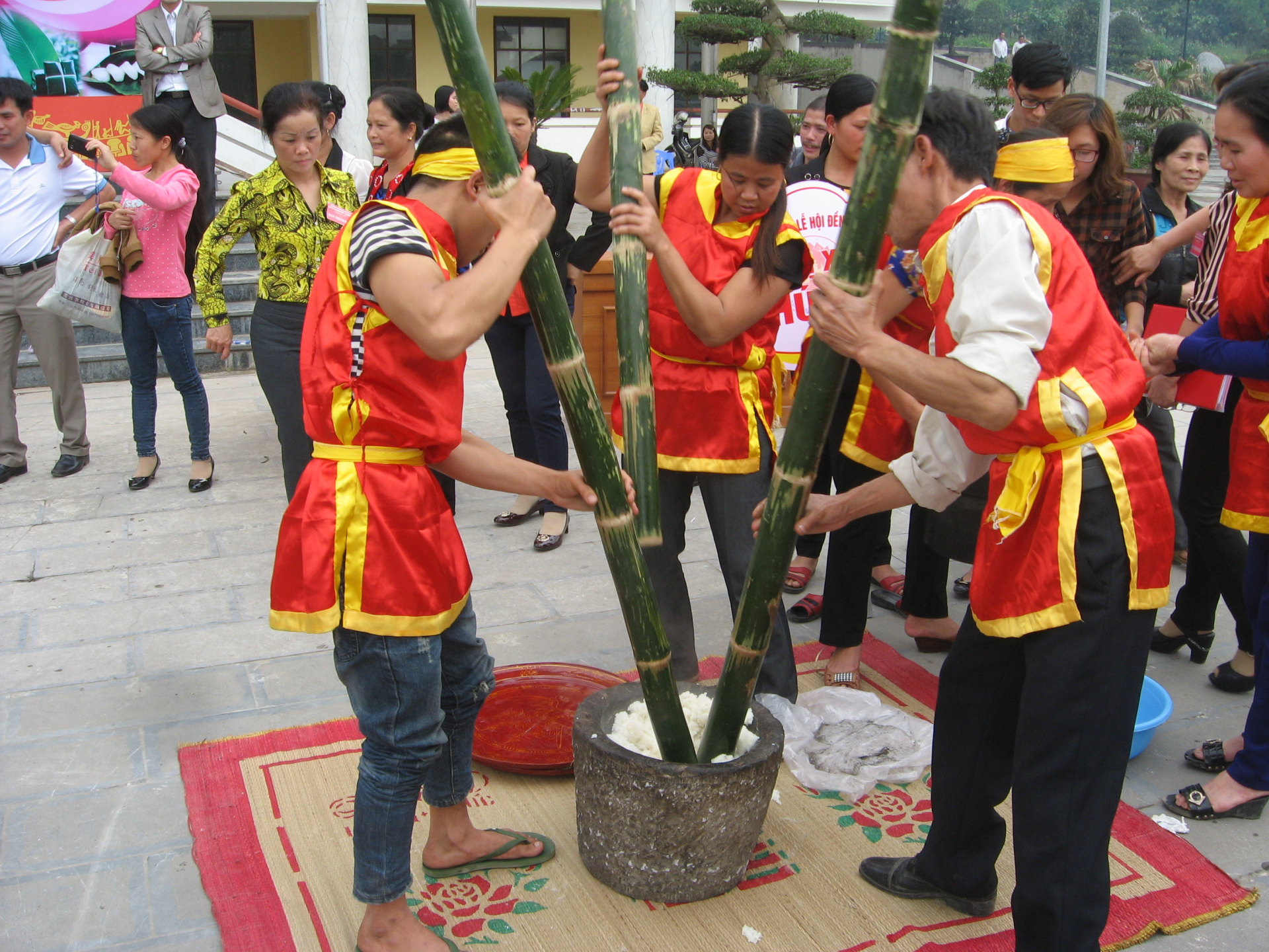| Thi giã bánh giầy trong lễ hội Đền Hùng. |