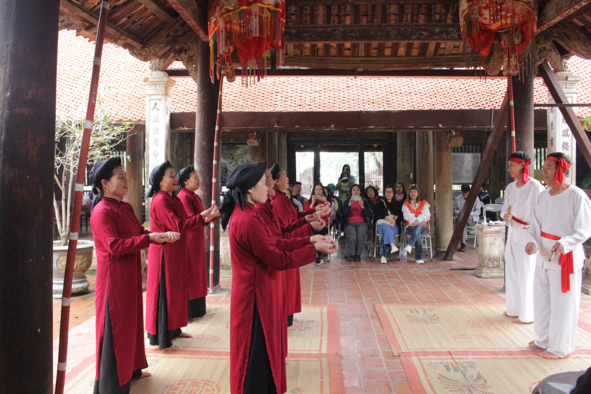 | Hát Xoan phục vụ du khách ở Đình cổ Hùng Lô. |