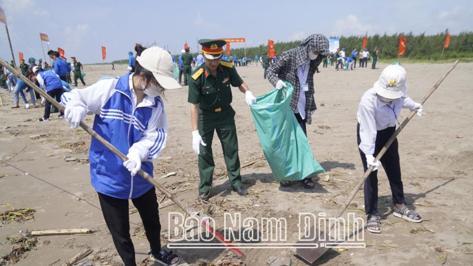| Đoàn viên, thanh niên, học sinh và cán bộ, chiến sĩ Bộ CHQS tỉnh làm sạch biển tại Khu du lịch thị trấn Thịnh Long (Hải Hậu). |