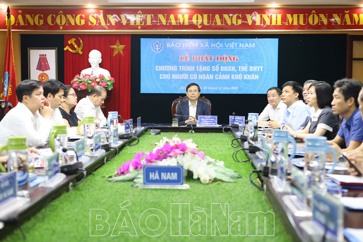 Sáng 23/11, Bảo hiểm xã hội (BHXH) Việt Nam tổ chức Lễ phát động tặng sổ BHXH, thẻ BHYT cho người có hoàn cảnh khó khăn năm 2022 theo hình thức trực tuyến toàn quốc. Dự lễ phát động tại điểm cầu Hà Nội có đồng chí Nguyễn Thế Mạnh, Bí thư Ban Cán sự Đảng, Tổng Giám đốc BHXH Việt Nam; lãnh đạo các Bộ, ngành cùng người dân khó khăn được tặng sổ BHXH, thẻ BHYT. Đồng chí Trần Xuân Dưỡng, Tỉnh ủy viên, Phó Chủ tịch UBND tỉnh dự hội nghị tại điểm cầu tỉnh Hà Nam. Cùng dự còn có lãnh đạo BHXH tỉnh, UBND các huyện, thị xã, thành phố, một số sở, ngành liên quan.