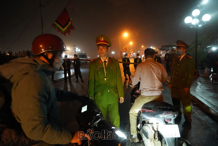 Lực lượng công an thực hiện phân luồng, hỗ trợ du khách về dự lễ hội nhằm bảo đảm an toàn giao thông, hạn chế tình trạng tắc nghẽn giao thông có thể xảy ra.