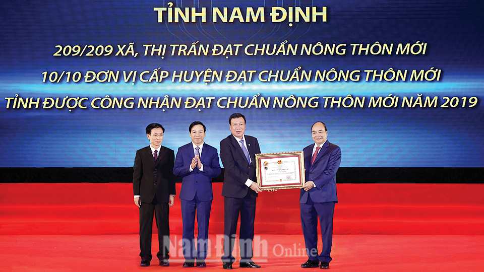 | Thủ tướng Chính phủ Nguyễn Xuân Phúc trao Huân chương Độc lập hạng Ba cho cán bộ, nhân dân tỉnh Nam Định và Bằng công nhận tỉnh Nam Định hoàn thành nhiệm vụ xây dựng nông thôn mới năm 2019. Ảnh: PV |