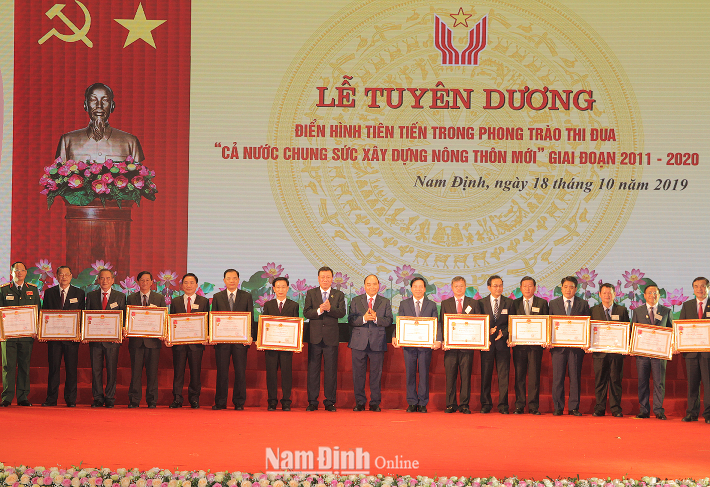 Tối 18-10, tại Nhà Văn hóa Trung tâm 3-2 (thành phố Nam Định), Hội đồng Thi đua - Khen thưởng Trung ương đã long trọng tổ chức Lễ tuyên dương điển hình tiên tiến trong phong trào thi đua "Cả nước chung sức xây dựng nông thôn mới" giai đoạn 2011-2020. Tới dự Lễ tuyên dương có đồng chí Nguyễn Xuân Phúc, Ủy viên Bộ Chính trị, Thủ tướng Chính phủ, Chủ tịch Hội đồng Thi đua - Khen thưởng Trung ương; đồng chí Nguyễn Sinh Hùng, nguyên Ủy viên Bộ Chính trị, nguyên Chủ tịch Quốc hội; các đồng chí Ủy viên Bộ Chính trị: Trần Quốc Vượng, Thường trực Ban Bí thư Trung ương Đảng; Vương Đình Huệ, Phó Thủ tướng Chính phủ, Trưởng Ban Chỉ đạo Trung ương các chương trình mục tiêu quốc gia; Võ Văn Thưởng, Bí thư Trung ương Đảng, Trưởng Ban Tuyên giáo Trung ương; các đồng chí Bí thư Trung ương Đảng: Trần Thanh Mẫn, Chủ tịch Ủy ban Trung ương Mặt trận Tổ quốc Việt Nam; Phan Đình Trạc, Trưởng Ban Nội chính Trung ương; Nguyễn Hòa Bình, Chánh án Tòa án nhân dân Tối cao; các đồng chí Ủy viên Ban Chấp hành Trung ương Đảng: Đặng Thị Ngọc Thịnh, Phó Chủ tịch nước, Phó Chủ tịch Thứ nhất Hội đồng Thi đua - Khen thưởng Trung ương; Phùng Quốc Hiển, Phó Chủ tịch Quốc hội; Nguyễn Xuân Cường, Bộ trưởng Bộ Nông nghiệp và Phát triển nông thôn, Phó Trưởng Ban Chỉ đạo Trung ương các Chương trình mục tiêu quốc gia; các đồng chí Ủy viên Ban Chấp hành Trung ương Đảng, Bộ trưởng, Bí thư các tỉnh, thành ủy, Ủy viên Ủy ban Thường vụ Quốc hội, Chủ nhiệm các Ủy ban của Quốc hội; lãnh đạo các bộ, ban, ngành Trung ương; lãnh đạo các tỉnh, thành phố, các tập đoàn, tổng công ty Nhà nước cùng đại diện 170 tập thể có thành tích xuất sắc trong phong trào thi đua cả nước chung sức xây dựng nông thôn mới của cả nước. Đồng chí Nông Đức Mạnh, nguyên Tổng Bí thư Ban Chấp hành Trung ương Đảng gửi lẵng hoa chúc mừng.