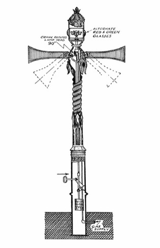 Chiếc đèn được thiết kế để mô phỏng cử chỉ của cảnh sát giao thông. Xe cộ phải dừng lại khi cả hai cánh vuông góc và được di chuyển khi chúng ở góc 45 độ. Đèn khí đốt màu đỏ và màu xanh lục được sử dụng vào ban đêm.