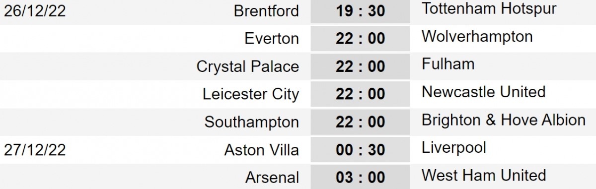 Ở trận đấu sớm nhất, Tottenham sẽ đến làm khách của Brentford. Trong khi đội bóng thành London sẽ vắng hàng loạt trụ cột do chấn thương và chưa trở lại sau World Cup thì đội chủ nhà lại có lực lượng mạnh nhất với tiền đạo Ivan Toney vẫn được phép ra sân khi chưa có thông báo chính thức từ FA về án phạt với những hành vi cá độ trong quá khứ. Trận đấu này sẽ diễn ra lúc 19h30.