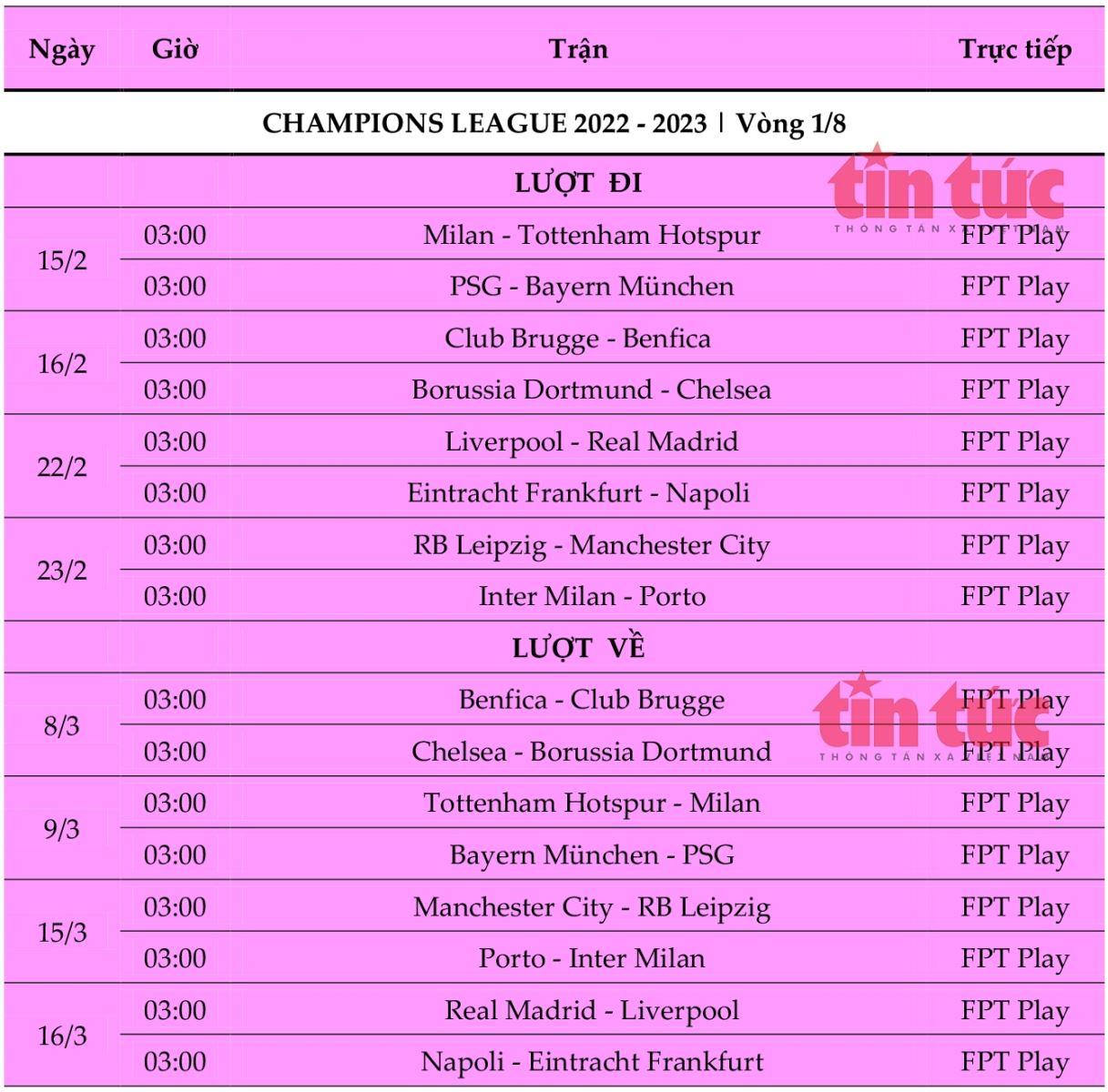 Toàn bộ lịch thi đấu bóng đá và truyền hình trực tiếp vòng 1/8 Champions League 2022 - 2023 được cập nhật mới nhất, chính xác nhất, đầy đủ nhất.