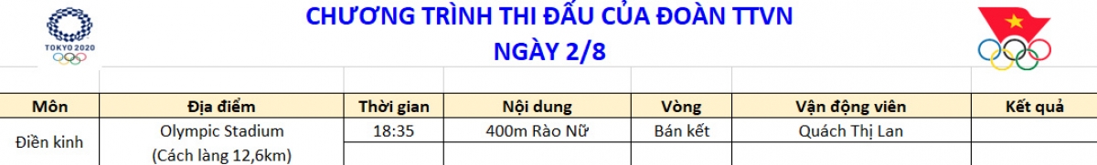 Người đại diện cho thể thao Việt Nam thi đấu hôm nay sẽ là VĐV điền kinh Quách Thị Lan. Quách Thị Lan sẽ thi đấu lượt chạy bán kết nội dung 400m rào nữ, đợt chạy đầu tiên. Cùng thi đấu ở loạt chạy này với Quách Thị Lan còn có 7 VĐV khác đến từ các quốc gia Na Uy, Đức, Bỉ, Jamaica, Mỹ, Canada và Italia.