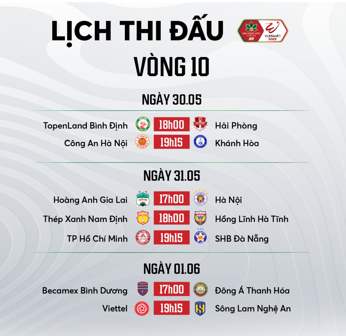 Hôm nay (30/5), vòng 10 V-League 2023 sẽ bắt đầu với 2 cặp đấu Bình Định - Hải Phòng FC và CLB Công an Hà Nội - Khánh Hoà.