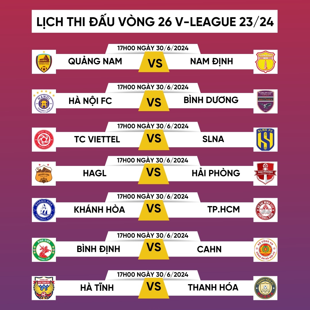 7 trận đấu ở vòng 26 V-League 2023/2024 sẽ diễn ra đồng thời lúc 17h hôm nay 30/6.
