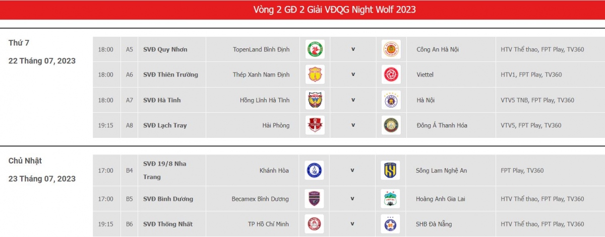 Theo lịch thi đấu vòng 2 giai đoạn 2 V-League 2023, các trận đấu sẽ diễn ra trong hai ngày 22 và 23/7.