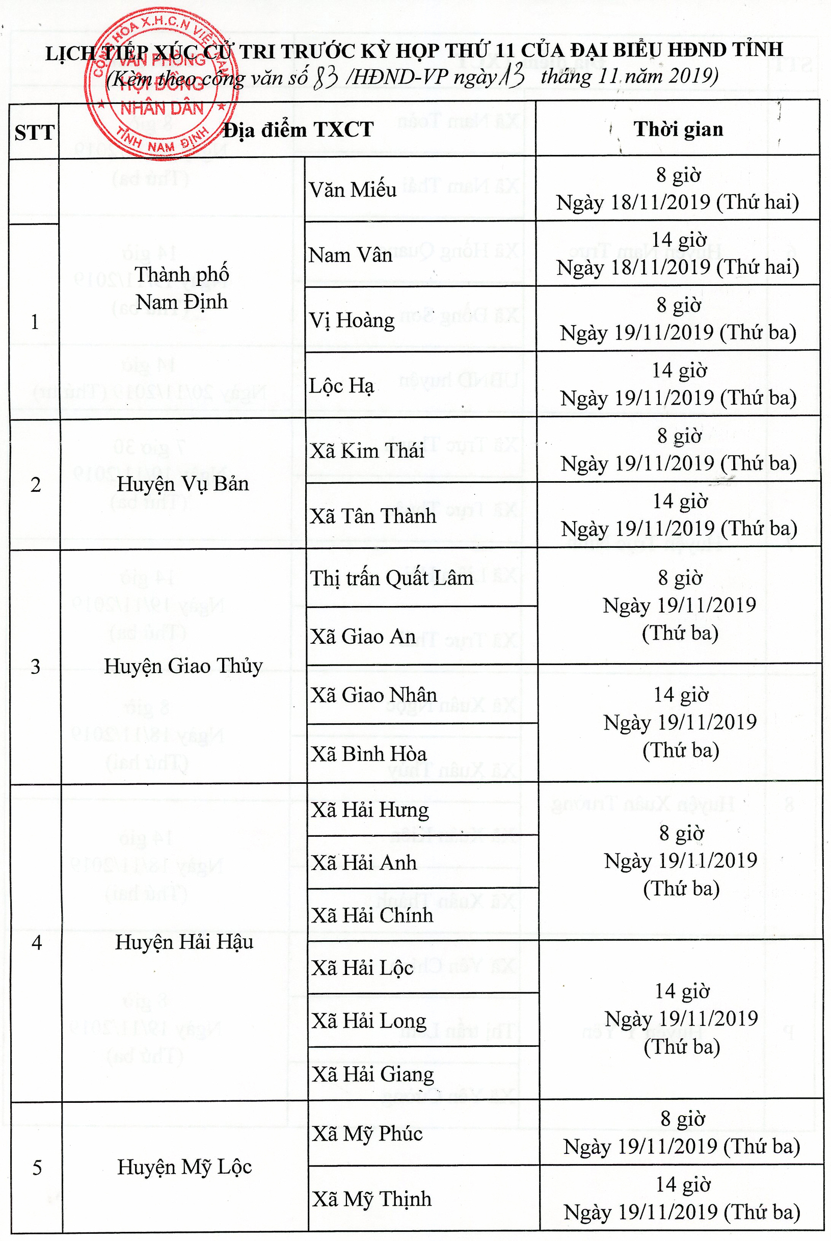 Lịch tiếp xúc cử tri trước kỳ họp thứ 11 của đại biểu HĐND tỉnh