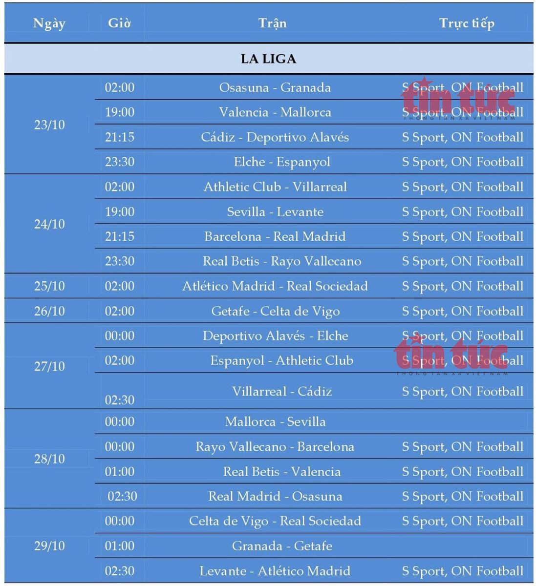 LỊCH THI ĐẤU BÓNG ĐÁ TÂY BAN NHA (LA LIGA)